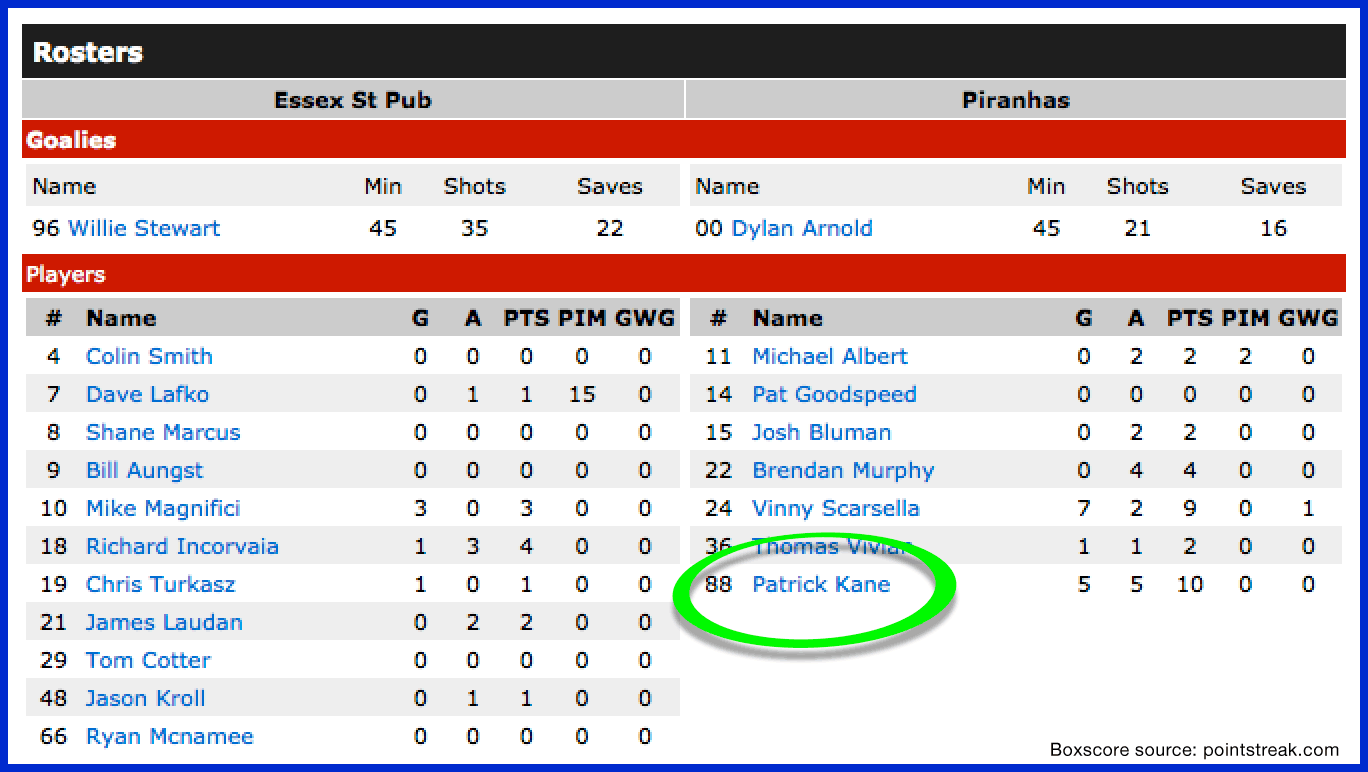 Humiliated by the defeat, and still stinging from dropping the NHL Western Conference Finals to the LA Kings, Kane hightailed it out of The Windy City to nurse his ego back home in upstate New York. The night before last, he initiated the rehabilitation of his shattered confidence by joining a rec-league hockey game with the Piranhas Hockey Club in Buffalo.