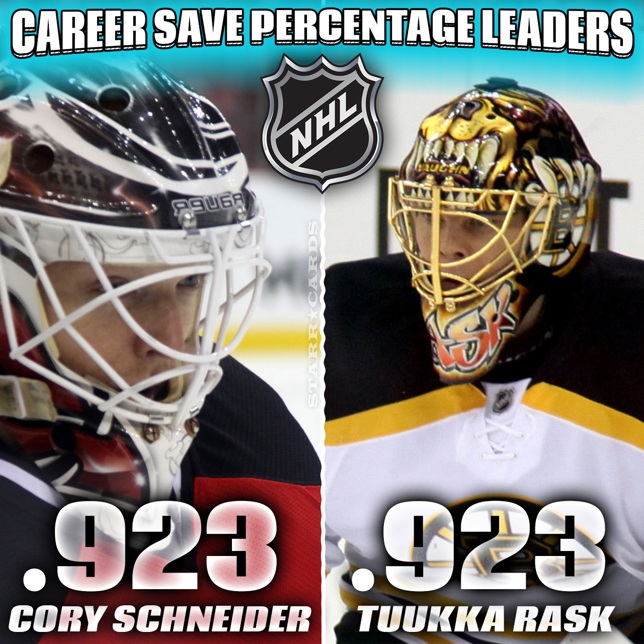 Two active players lead the NHL in all-time save percentage; Cory Schneider and Tuukka Rask are both currently sitting on .923 for their careers. Just off their pace are Dominik Hasek and Braden Holtby (.922).