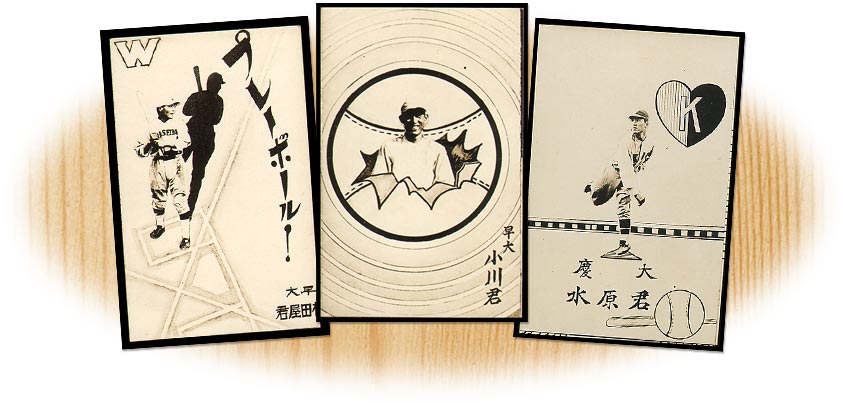 Bromides, mass-produced collectible photographs printed on photo paper with blank backs, became common in Japan starting in the late 1920s. These cards usually depict popular college stars or visiting American players. The JBR 32 set pictured below blends photographic images with artistic graphics.