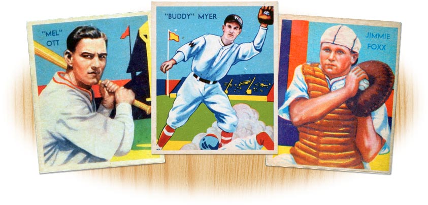 In 1933, Goudey produced a 240 card set, known as “Big League Chewing Gum”. These cards were the first to be packaged with gum. Along with the T206 American Tobacco Company and 1952 Topps sets, the 1933 Goudey cards are considered part of the “Big Three” of classic baseball card sets.