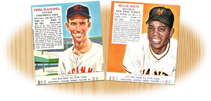 Early in its history, Red Man chewing tobacco advertisements were painted on the sides of barns, featuring an endorsement from baseball player Nap Lajoie: “Lajoie chews Red Man, ask him if he don’t.” From 1952 to 1955, Red Man produced a series of baseball cards, the only tobacco company to do so after 1920.