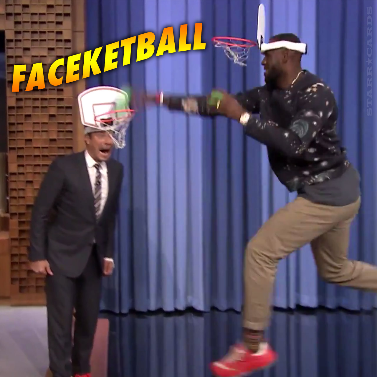 With the score knotted at 2-2, the host suddenly decided to switch to a dunk-off. Fallon put one down on the 6’8″ four-time MVP, before James responded with a rim-wreaking double jam for the 4-3 win.