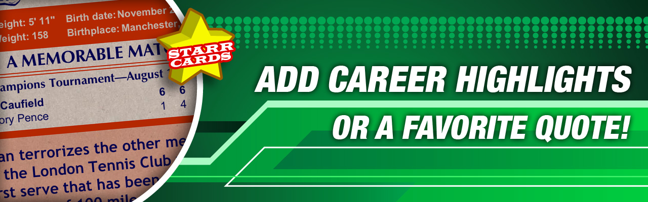 No other card maker offer the features of Starr Cards. Enter the score from your most memorable match including opponent, date and venue.