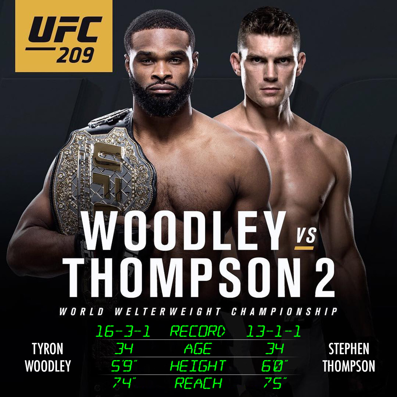 One of the most exciting title rematches in welterweight history goes down at UFC 209 when current champ Tyron Woodley takes on Stephen “Wonderboy” Thompson this Saturday at 10pm ET only on PPV.