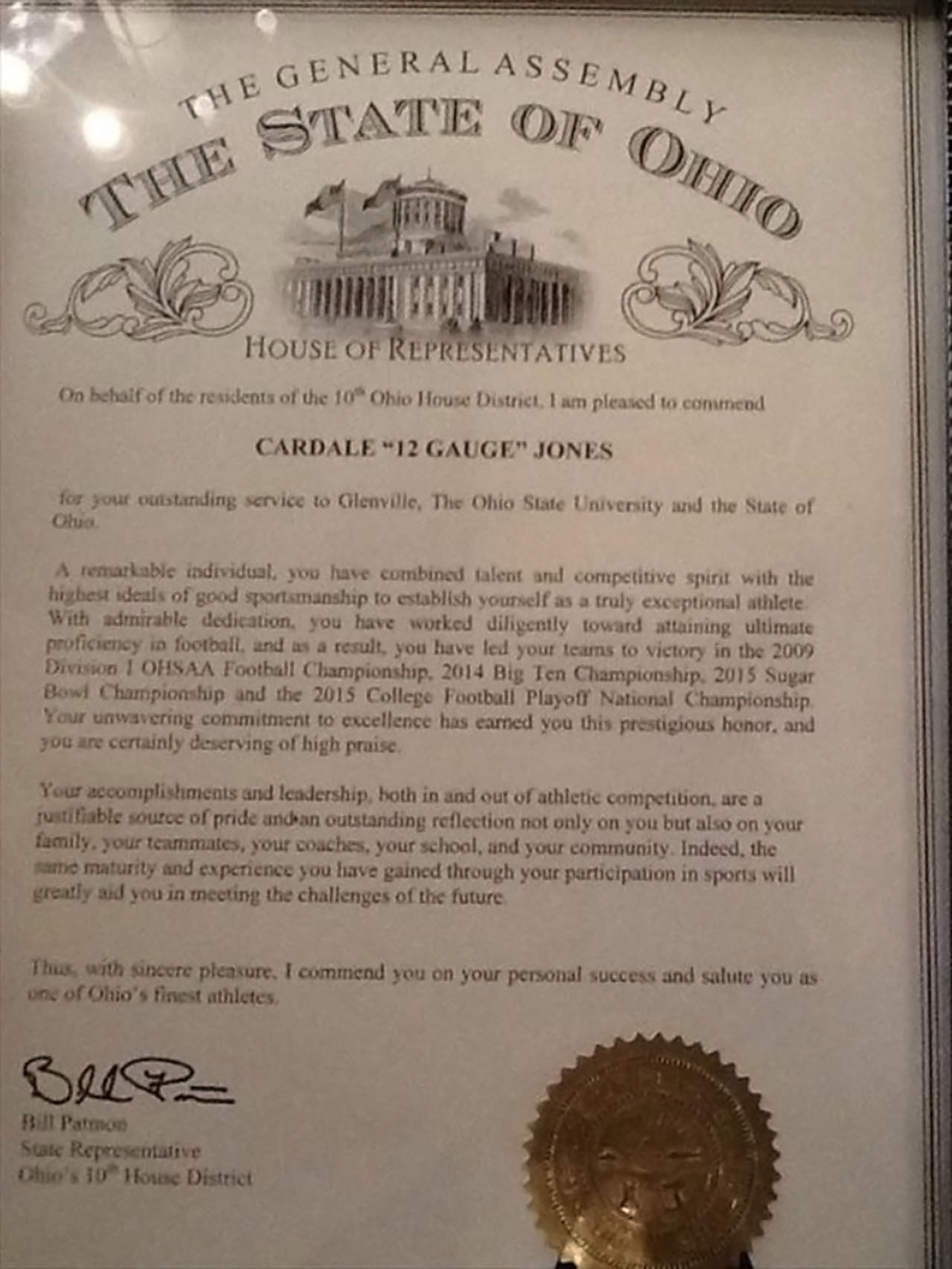 Jones’ “12 Gauge” nickname is based upon his jersey number and big-gun of an arm. Recently the Ohio state legislature helped elevate the moniker above his many others, by including it in an official commendation for his ‘outstanding service to Glenville, The Ohio State University and the State of Ohio.’