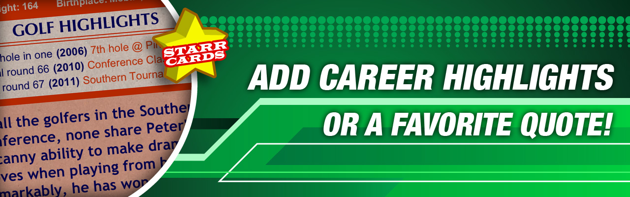 No other card maker offers the depth or versatility of Starr Cards. Add an inspirational quote or the golfer’s career highlights.